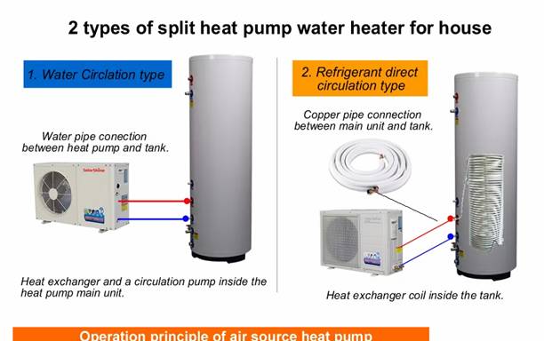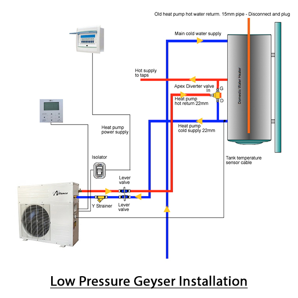2 pompes á chaleur, une connectée directement au chauffe-eau existant type Geyser, au dessus une pour chauffage/climatisation devant une mini-éolienne qui ré-injecte le courant dans une des thermopompes.